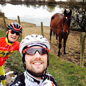 On a fait une pause près d'un haras pour saluer des chevaux. J'ai commencé à en caresser un (qui n'en avait visiblement pas très envie), deux autres se sont approchés. Eux ont été contents que je m'intéresse à leur museau. Comme je commençais à avoir mal aux jambes, je me suis dit qu'un changement de monture pour quelques kilomètres permettrait de soulager ma musculature ... j'ai pris appui sur un poteau qui n'était pas fixé au sol (il ne tenait debout que grâce aux barbelés) et ai failli finir les 4 sabots en l'air. Mon téléphone ayant décidé de faire grève (comme quoi, on peut venir de chine et refuser de travailler non-stop 7j/7 et 24h/24), les photos illustrant cet article ont été prises par Julien. Je n'ai pas encore investi dans un vélo électrique pour que Clémence (ma compagne) puisse nous suivre et nous photographier à l'entraînement.