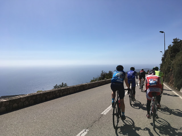 J'ai poursuivi ma route quelques minutes en solitaire jusqu'à La Turbie. J'ai attaqué un faux-plat montant en direction d'Eze, un groupe d'une dizaine de cyclistes m'a doublé et je me suis accroché dans leurs roues. Je commençais à être cuit et ne savais plus trop où j'en étais dans le parcours. Le faux-plat montant a été vite avalé. J'étais content car on a emprunté une belle descente avec vue splendide sur la mer pour rejoindre le village d'Eze, je pensais que ce faux-plat montant était la dernière ascension du jour et que ça avait été bien plus facile que ce à quoi je m'attendais. C'était vraiment beau et j'en ai profité, pensant déjà que j'étais en train de redescendre en direction de Nice et que c'était fini.